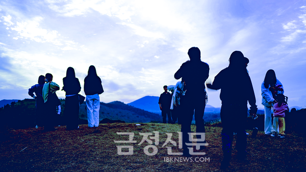 지는 해가 저녘을 찾아 숨으러 들어 가려 합니다. 관광객들이 오름에 올라 빛이 아름다워 둔덕을 찾아 노을을 감상하려는 가 봅니다. 요즘 가을 억새로 제주 오름들엔 관광객이 만원입니다. 이렇게 가을이 좋은 가 봅니다. (사진은 5일 저녘 5시 30분경 찍었습니다.)